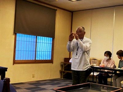 終わる前に、今日覚えた自己紹介を、できるだけ多くの会員やスタッフの前に行って、移動しながら復習しました。 |